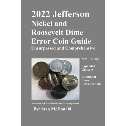 The 2022 Jefferson Nickel and Roosevelt Dime Error Coin Guide includes minor error types not usually encapsulated and additional variations not found in other coin guides. No other guide has over 2,000 validated error listings, which give the collector the edge in buying and selling coins. Presented in this guide: - Complete error descriptions and photos- A detailed description of mint error classifications with photographs. - Modern-day photographs of error coins. Listings in this book include: - Die errors - Errors created from broken dies, collars, misaligned dies, cuds, die cracks, DDO, DDR, off-center, and more. - Planchet errors - cracked, clips, defective, wrong stock, lamination, unplated, wrong metal, etc. - Striking errors - Errors caused in the minting process - bonded, broadstruck, brockage, clashed dies, double struck, indent, flip over, uniface, and more.